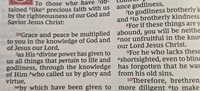 Today is day 11 of the Global Bible Month Challenge and we're in 2 Peter chapter 1, where Peter teaches us about the importance of growing in faith and virtue.In verses 2 through 4, Peter begins by reminding us that through God's divine power, we have everything we need for a godly life. Folks, by … Continue reading Global Bible Month Challenge Day 11